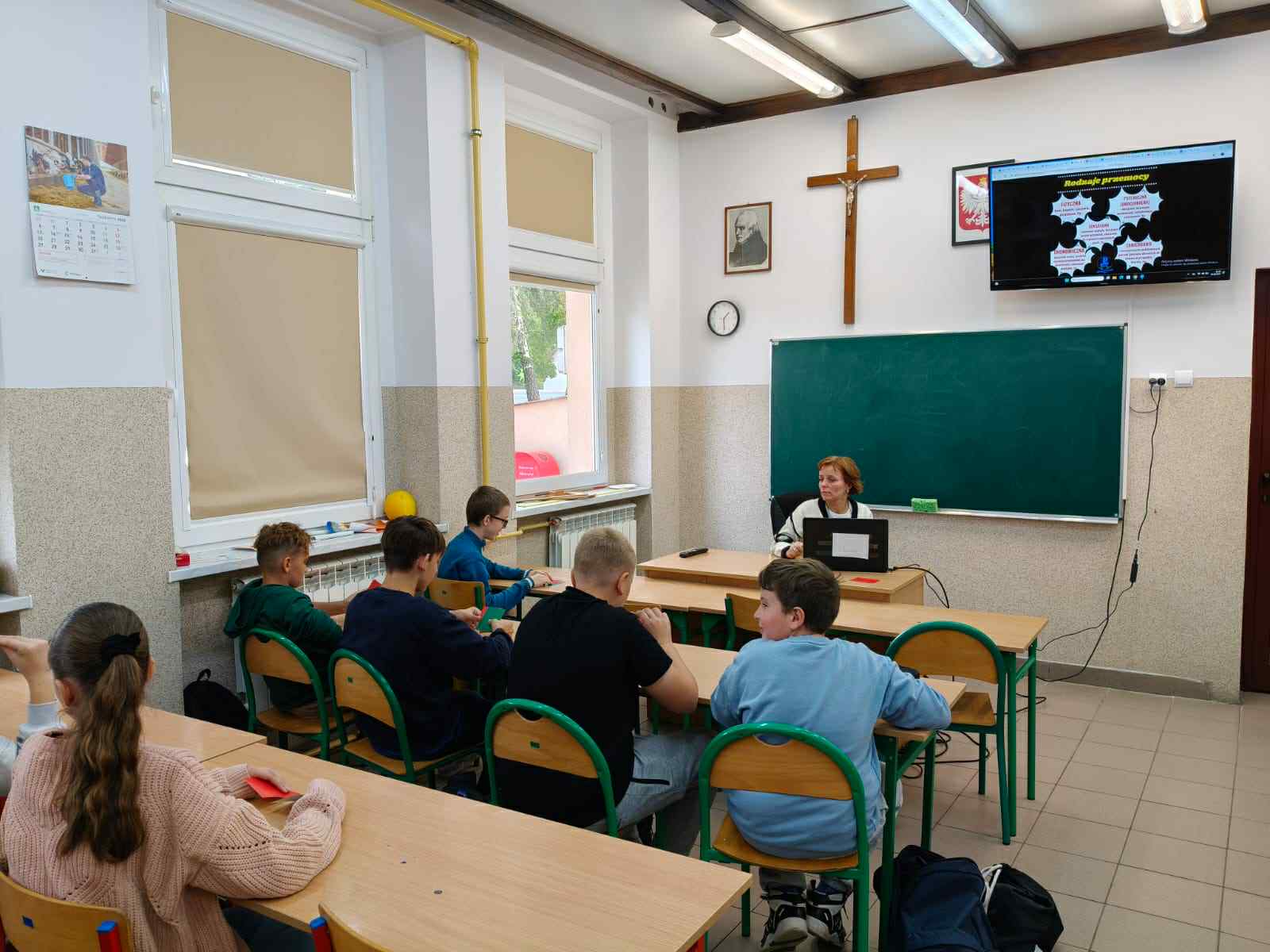 W ramach Tygodnia Przeciwdziałania Przemocy Rówieśniczej psycholog szkolny wraz z wychowawcą przeprowadził warsztaty w klasie VI. Celem spotkania było uwrażliwienie uczniów na problem przemocy oraz kształtowanie postaw opartych na szacunku, empatii i odpowiedzialności. Uczniowie wspólnie definiowali pojęcie przemocy, omawiali jej formy i zastanawiali się, jak reagować w sytuacjach zagrożenia oraz gdzie szukać pomocy. Zajęcia oparte na pracy w grupach cieszyły się dużym zaangażowaniem, a ich efektem jest większa świadomość uczniów i promowanie życzliwości w relacjach rówieśniczych.