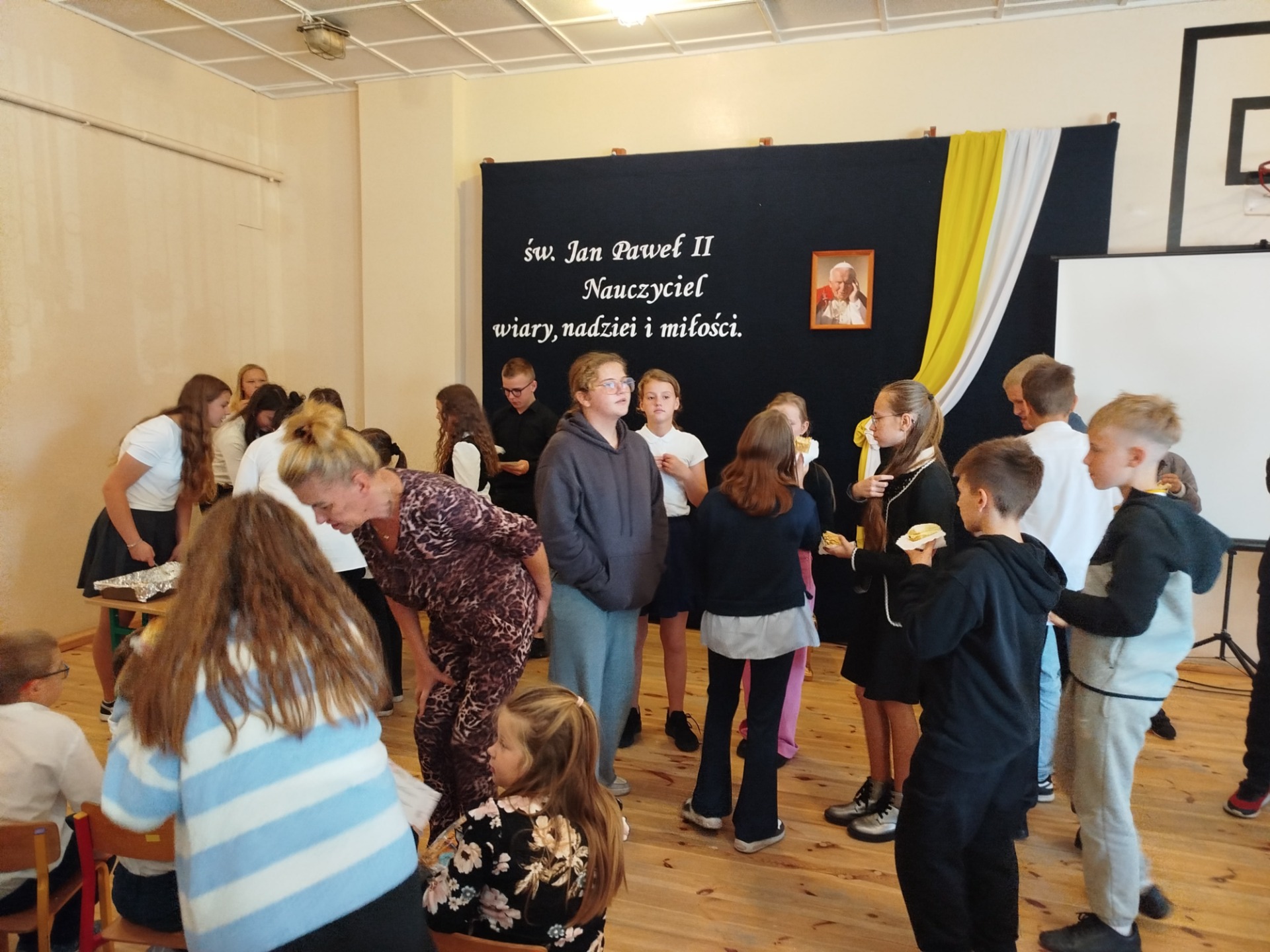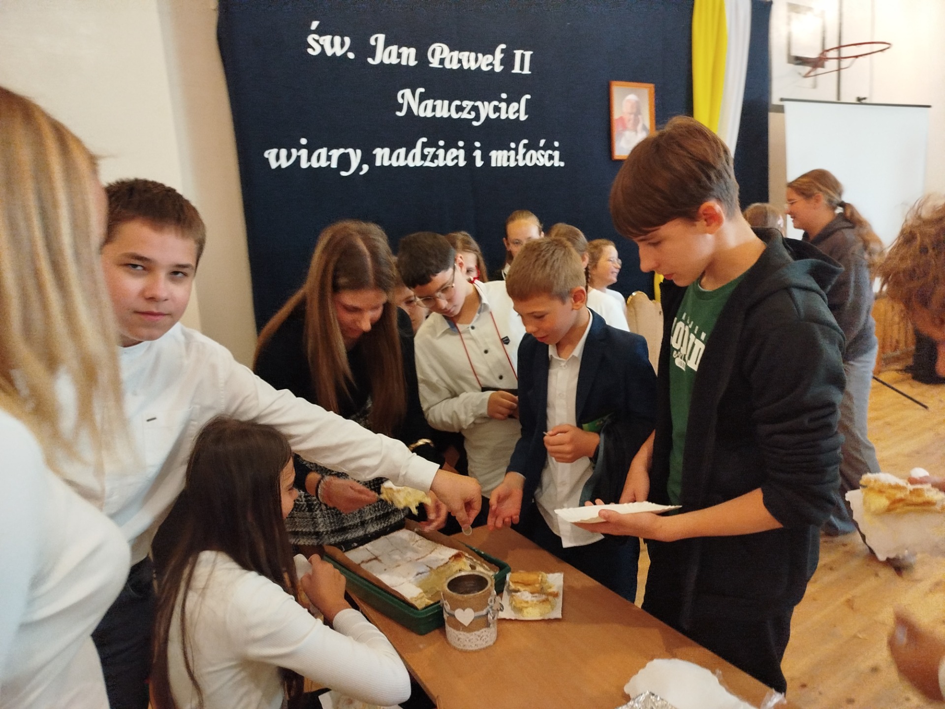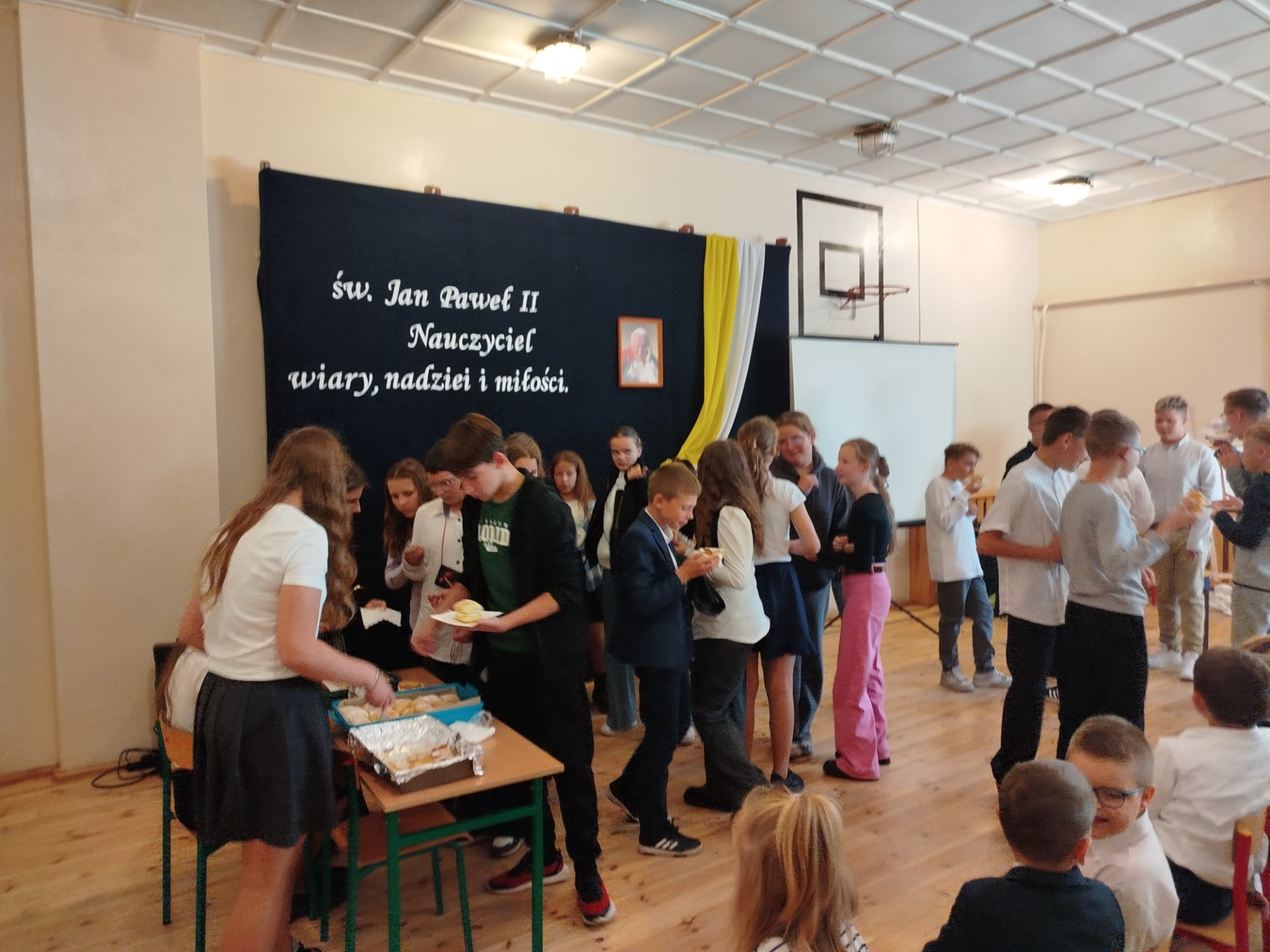 Gratulujemy wszystkim uczestnikom konkursu! Na zakończenie uroczystości odbył się kiermasz papieskich kremówek – ulubionych ciastek św. Jana Pawła II. Serdecznie dziękujemy wolontariuszkom Koła ,,Iskierka Dobroci – uczennicom naszej szkoły – za własnoręcznie upieczenie kremówek. Dochód ze sprzedaży zostanie przekazany na rehabilitację jednej z naszych uczennic Marty Kusz. Całość apelu i oprawę artystyczną przygotowano pod kierunkiem pani Anny Kuchty. Uroczystość dostarczyła wielu wzruszeń i na długo pozostanie w naszej pamięci. Wszystkim zaangażowanym w przygotowanie uroczystości serdecznie dziękujemy.