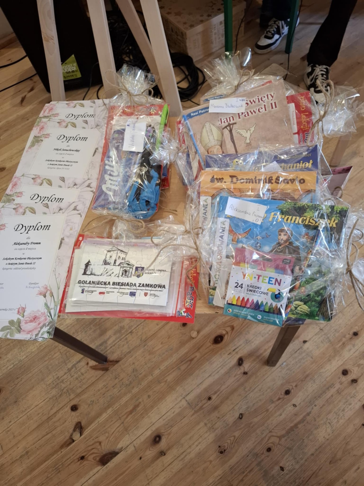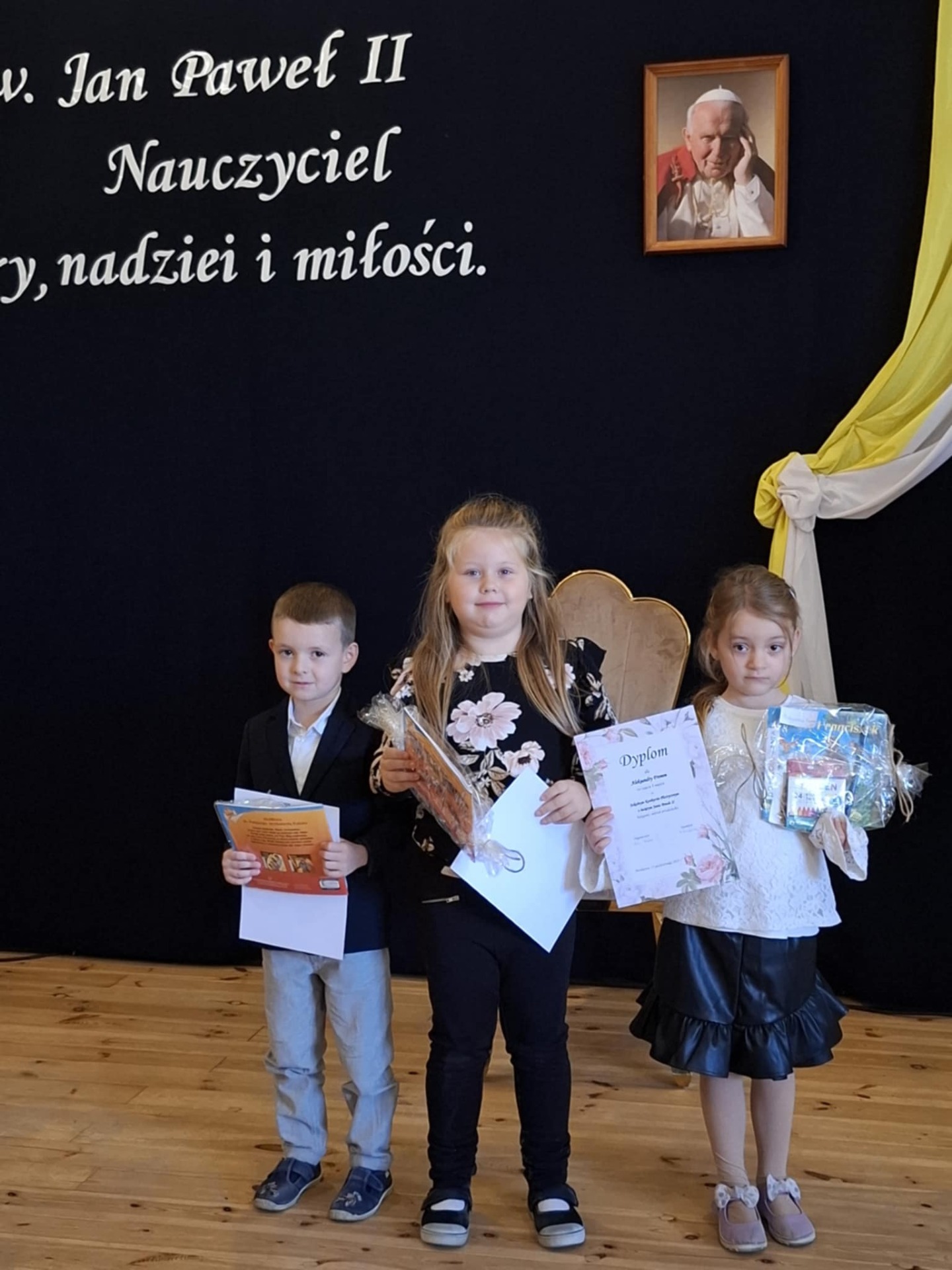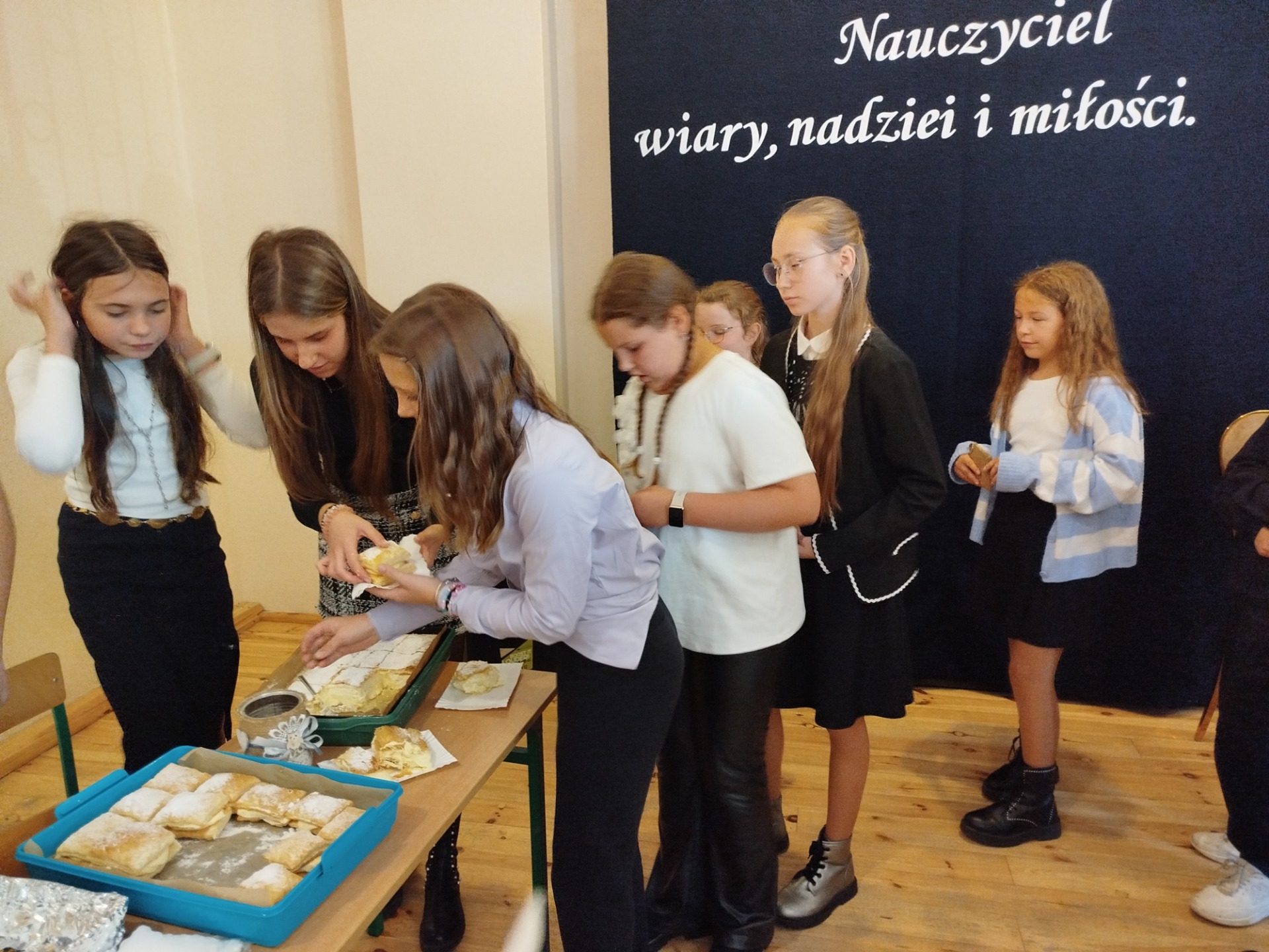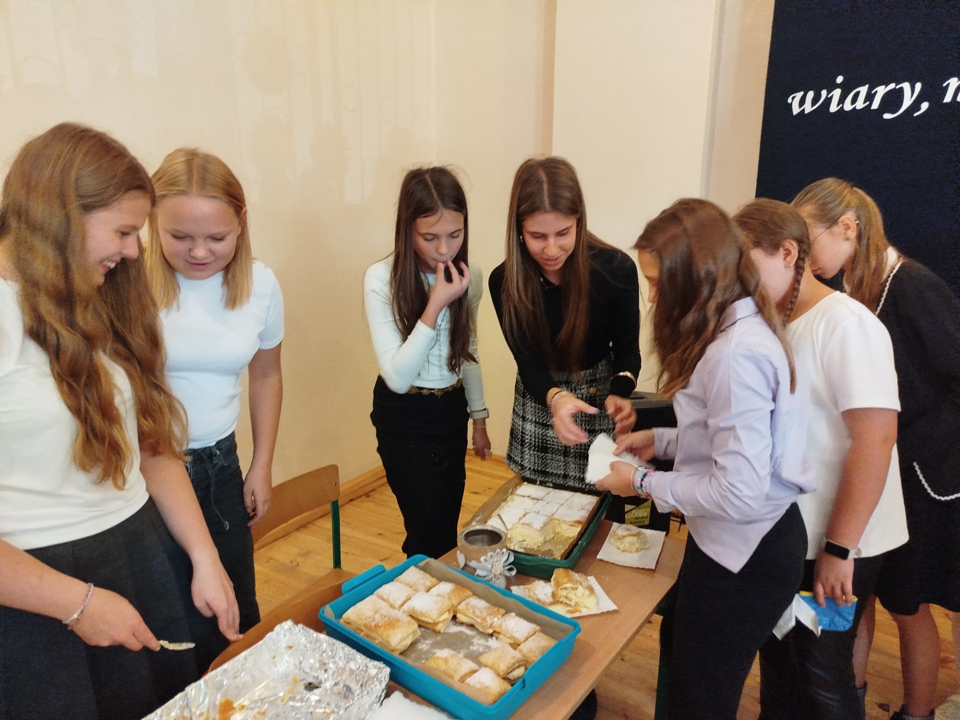 Gratulujemy wszystkim uczestnikom konkursu! Na zakończenie uroczystości odbył się kiermasz papieskich kremówek – ulubionych ciastek św. Jana Pawła II. Serdecznie dziękujemy wolontariuszkom Koła ,,Iskierka Dobroci – uczennicom naszej szkoły – za własnoręcznie upieczenie kremówek. Dochód ze sprzedaży zostanie przekazany na rehabilitację jednej z naszych uczennic Marty Kusz. Całość apelu i oprawę artystyczną przygotowano pod kierunkiem pani Anny Kuchty. Uroczystość dostarczyła wielu wzruszeń i na długo pozostanie w naszej pamięci. Wszystkim zaangażowanym w przygotowanie uroczystości serdecznie dziękujemy.
