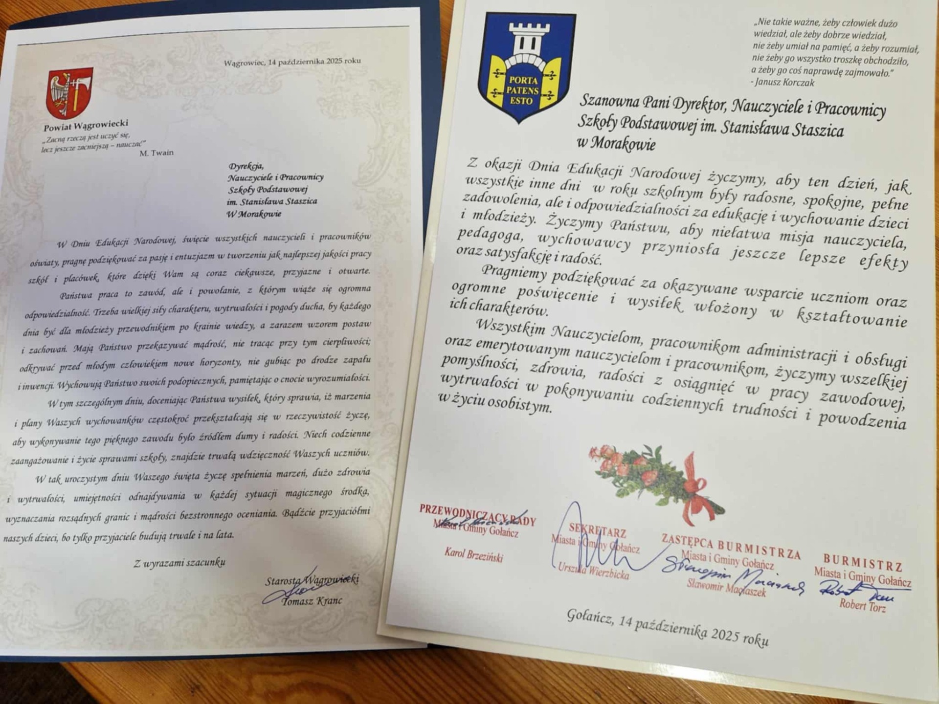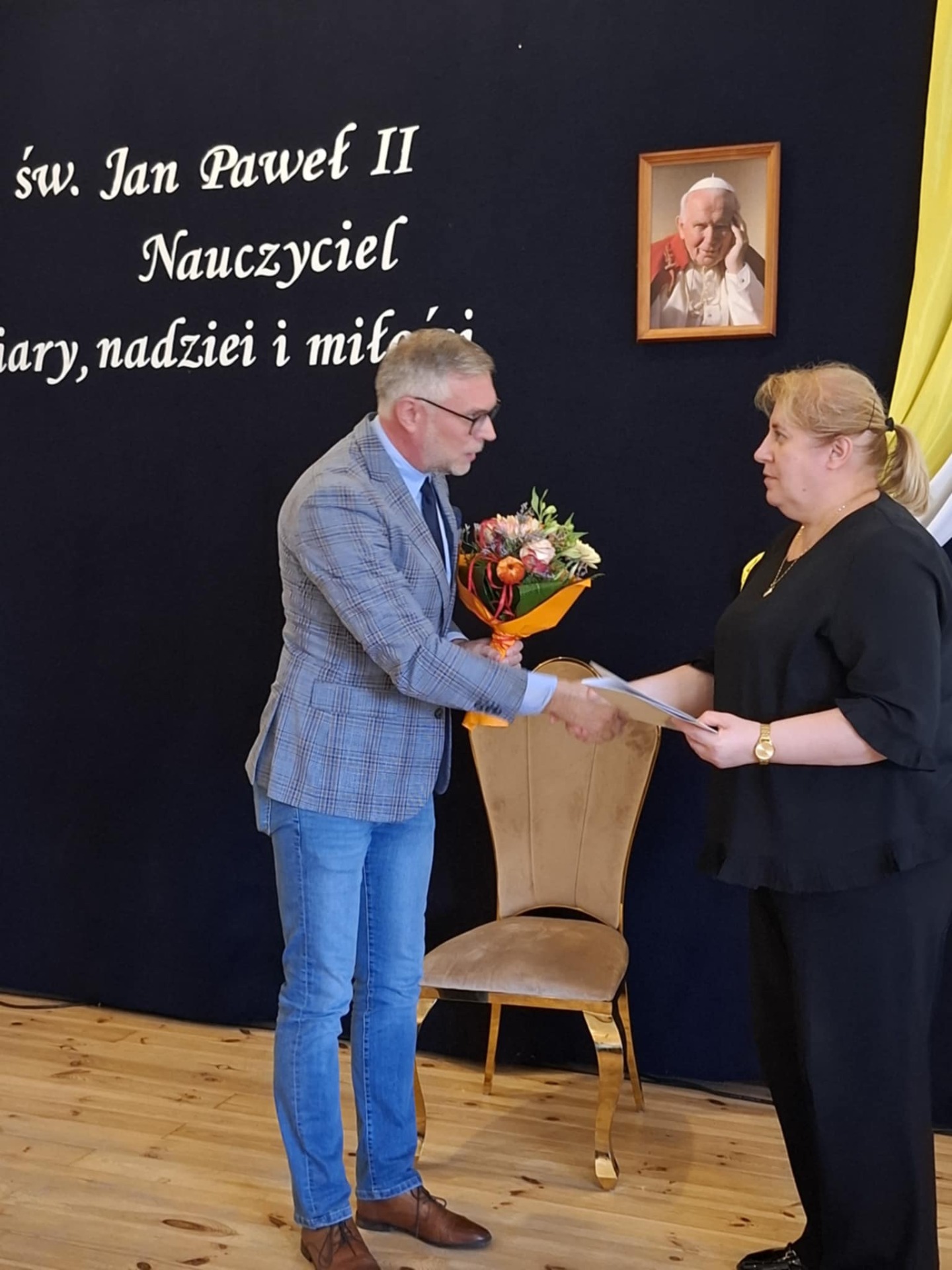 Goście złożyli serdeczne życzenia oraz wręczyli kwiaty i upominki na ręce pani dyrektor Magdaleny Brząkały. Pani dyrektor podziękowała za obecność i złożyła wszystkim – nauczycielom, uczniom i pracownikom szkoły – życzenia wielu sukcesów z okazji Dnia Edukacji Narodowej. Podczas apelu nastąpiło rozstrzygnięcie konkursu „Jan Paweł II – Nauczyciel”.