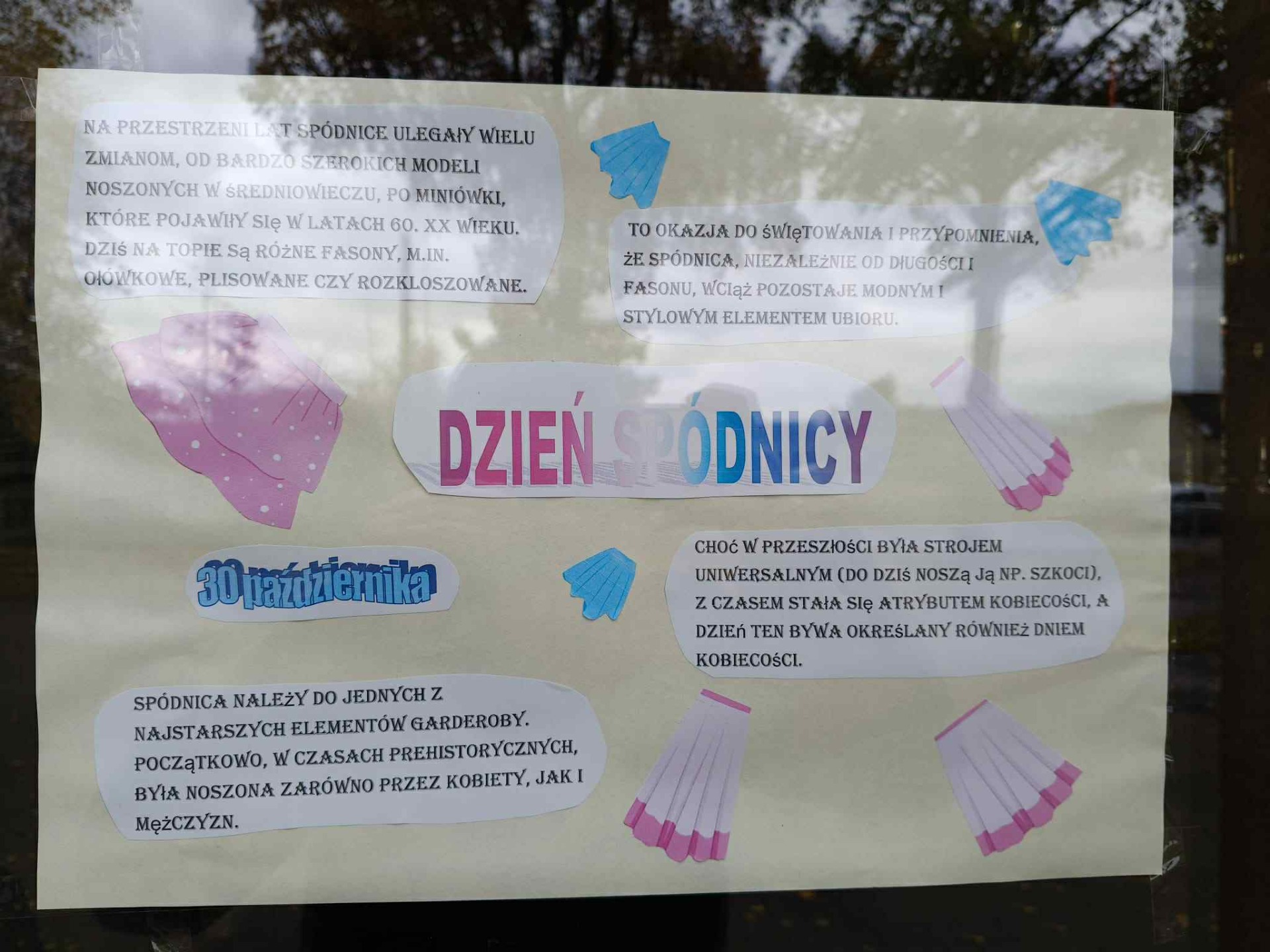 30 października z inicjatywy Samorządu Uczniowskiego obchodzono w naszej szkole Dzień Spódnicy. Dziewczynki ubrały tego dnia ulubione spódniczki, chłopcy natomiast zamiast spódniczek założyli krawaty. Dzień ten ma nam przypominać historię i znaczenie spódnicy jako elementu odzieży. Dlatego też 30 października na całym świecie obchodzony jest Światowy Dzień Spódnicy zwany też Dniem Kobiecości, gdyż nie od dziś wiadomo, że spódnica czy sukienka to atrybut kobiecości.