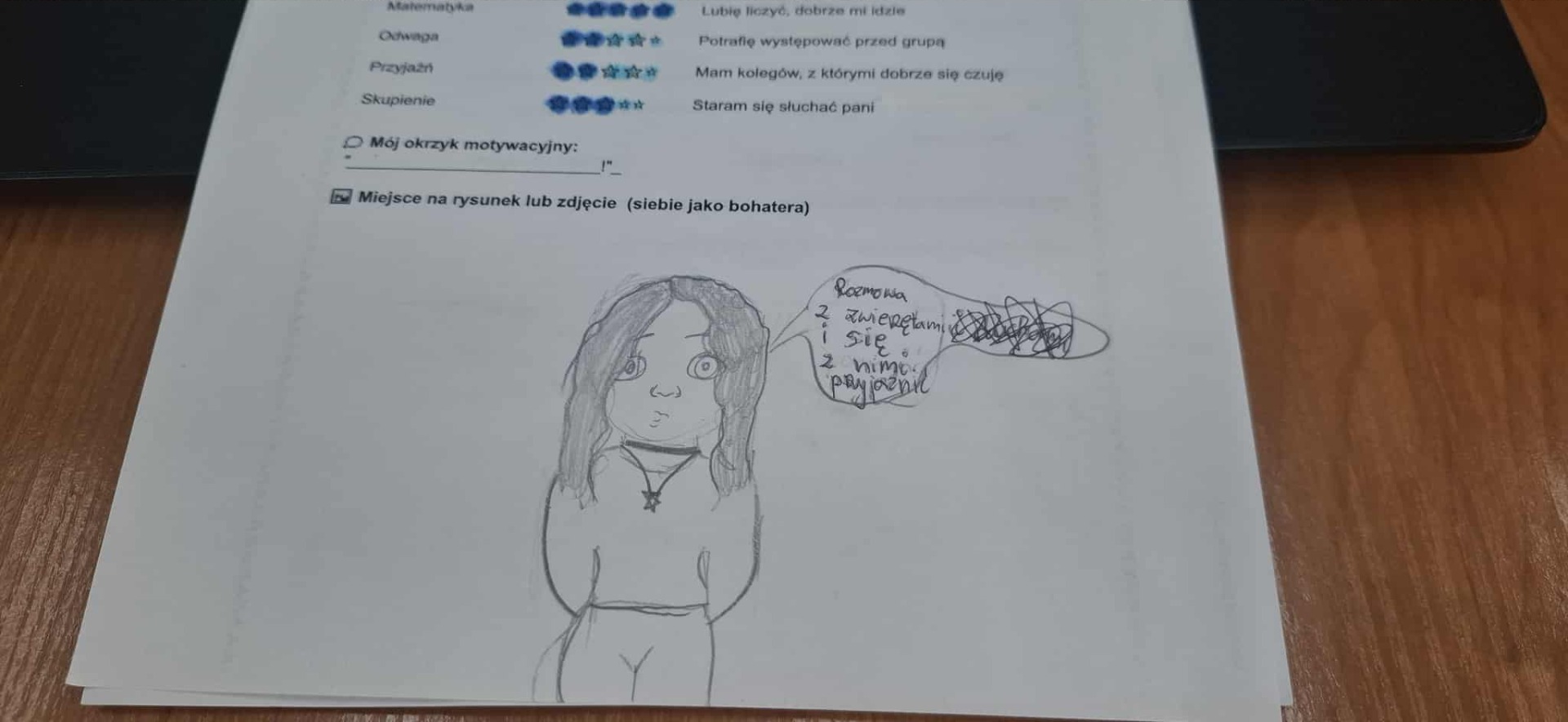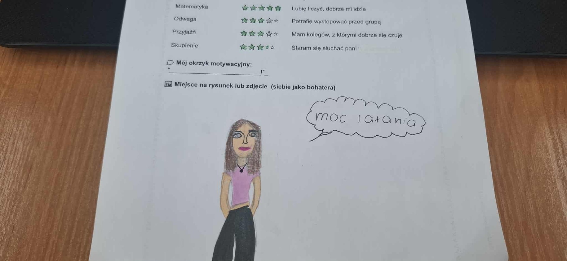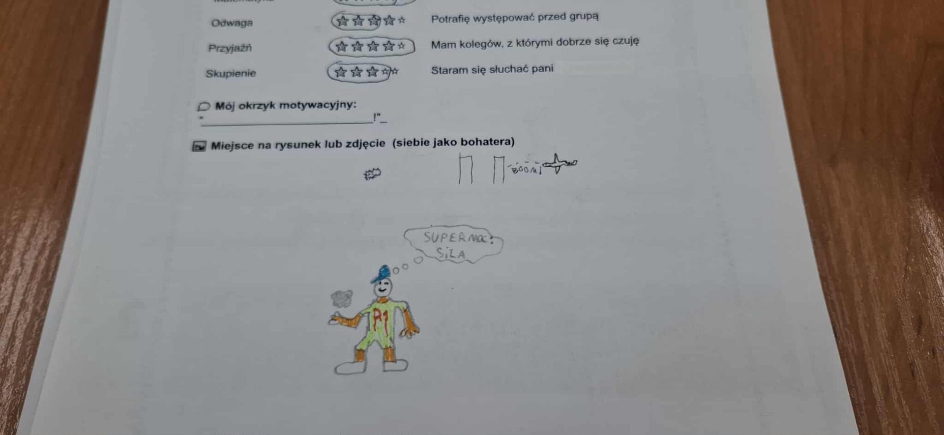 Zajęcia w klasie 5 rozpoczęły się krótką rozmową wprowadzającą na temat cech i talentów, które każdy z nas posiada. Następnie uczniowie otrzymali zadanie, aby przedstawić siebie jako bohatera lub bohaterkę z supermocami. Dzieci miały opisać, jakie mają moce i w jaki sposób wykorzystują je, aby pomagać innym. Każdy uczeń zaprezentował swoją postać przed klasą. W trakcie prezentacji pozostali uczniowie mogli zadawać pytania, co sprzyjało lepszemu poznaniu się i budowaniu pozytywnej atmosfery. Uczniowie bardzo aktywnie uczestniczyli w zajęciach. Większość wykazała się dużą kreatywnością i poczuciem humoru. Widać było zaangażowanie oraz chęć do współpracy. Zajęcia pozwoliły lepiej poznać zainteresowania i cechy poszczególnych uczniów, a także zintegrować grupę.