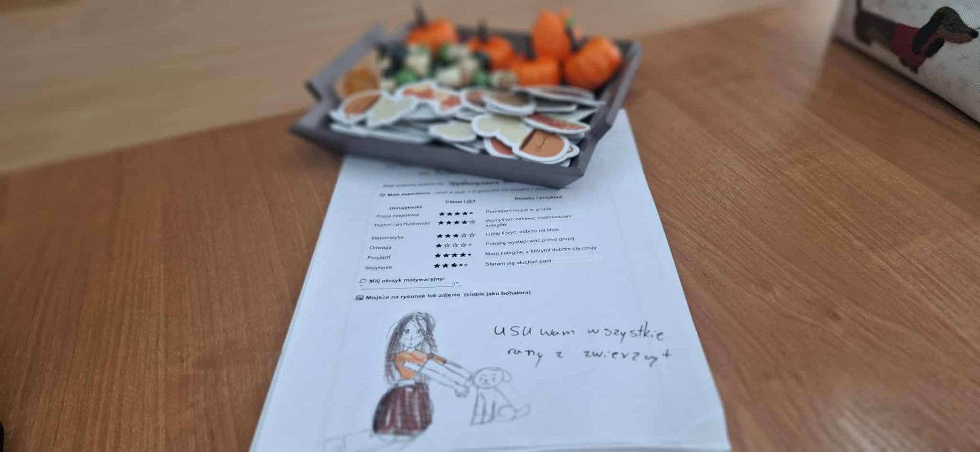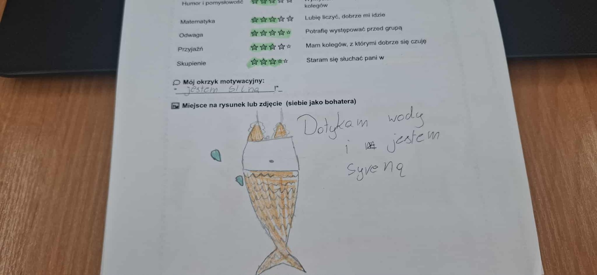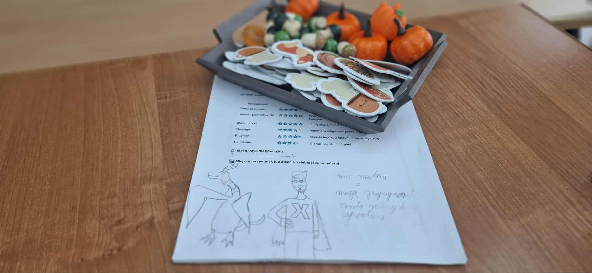 Zajęcia w klasie 5 rozpoczęły się krótką rozmową wprowadzającą na temat cech i talentów, które każdy z nas posiada. Następnie uczniowie otrzymali zadanie, aby przedstawić siebie jako bohatera lub bohaterkę z supermocami. Dzieci miały opisać, jakie mają moce i w jaki sposób wykorzystują je, aby pomagać innym. Każdy uczeń zaprezentował swoją postać przed klasą. W trakcie prezentacji pozostali uczniowie mogli zadawać pytania, co sprzyjało lepszemu poznaniu się i budowaniu pozytywnej atmosfery. Uczniowie bardzo aktywnie uczestniczyli w zajęciach. Większość wykazała się dużą kreatywnością i poczuciem humoru. Widać było zaangażowanie oraz chęć do współpracy. Zajęcia pozwoliły lepiej poznać zainteresowania i cechy poszczególnych uczniów, a także zintegrować grupę.