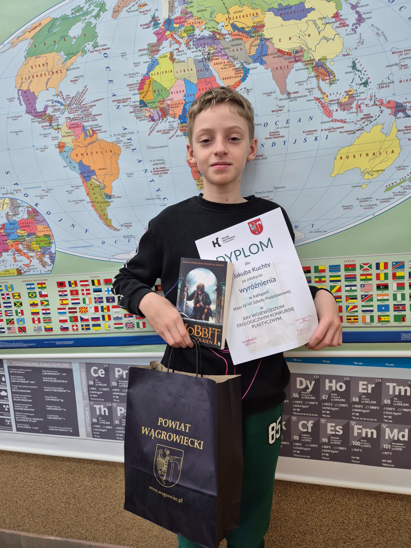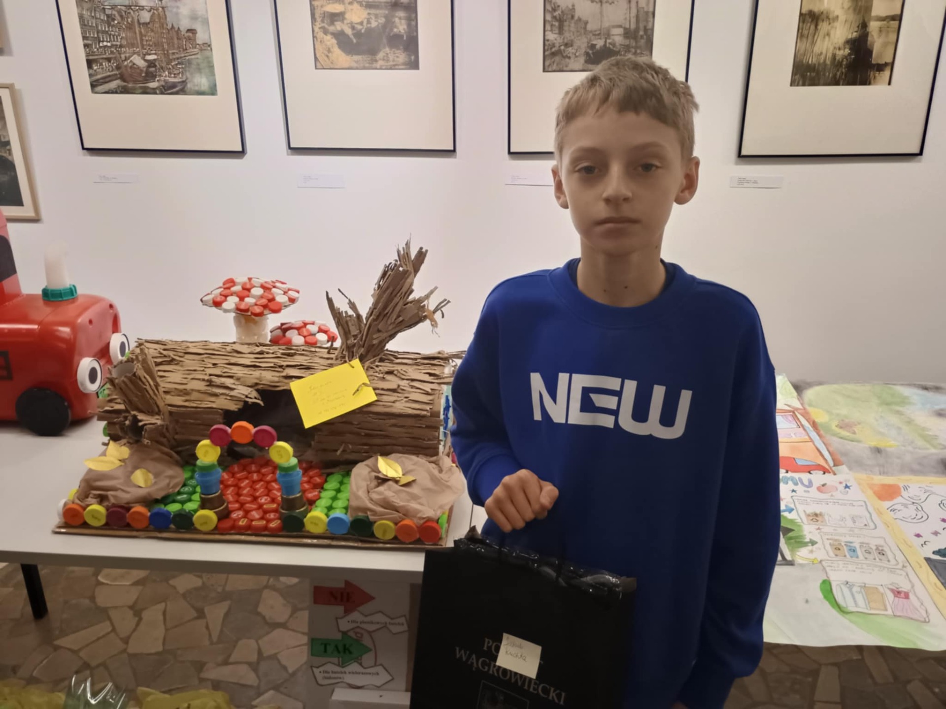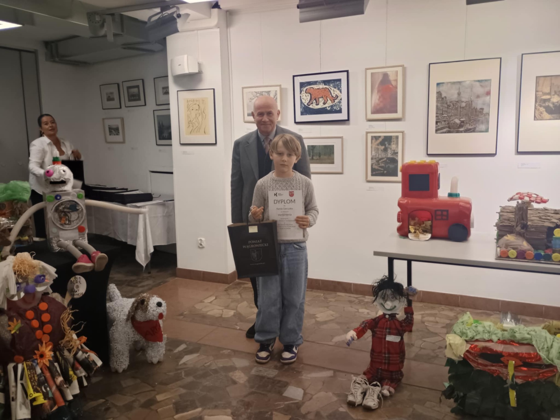 W poniedziałek, 17 listopada 2025 r., w Galerii Miejskiego Domu Kultury w Wągrowcu odbyło się podsumowanie jubileuszowej, XXV edycji konkursu plastycznego EKOIMPRESJE 2025. W wydarzeniu wzięli udział młodzi twórcy z całego województwa, prezentując prace inspirowane tematyką ekologiczną. W kategorii klas I–III „Mój przyjaciel z recyklingu” wyróżnienie zdobył: Karol Gierczak z klasy III, natomiast w kategorii klas IV- VIII “Domek dla jeżyka”, wyróżnienie zdobył Jakub Kuchta z klasy V. Tegoroczne „Ekoimpresje” po raz kolejny udowodniły, jak wielką kreatywnością wykazują się młodzi artyści, poruszając temat ochrony środowiska.