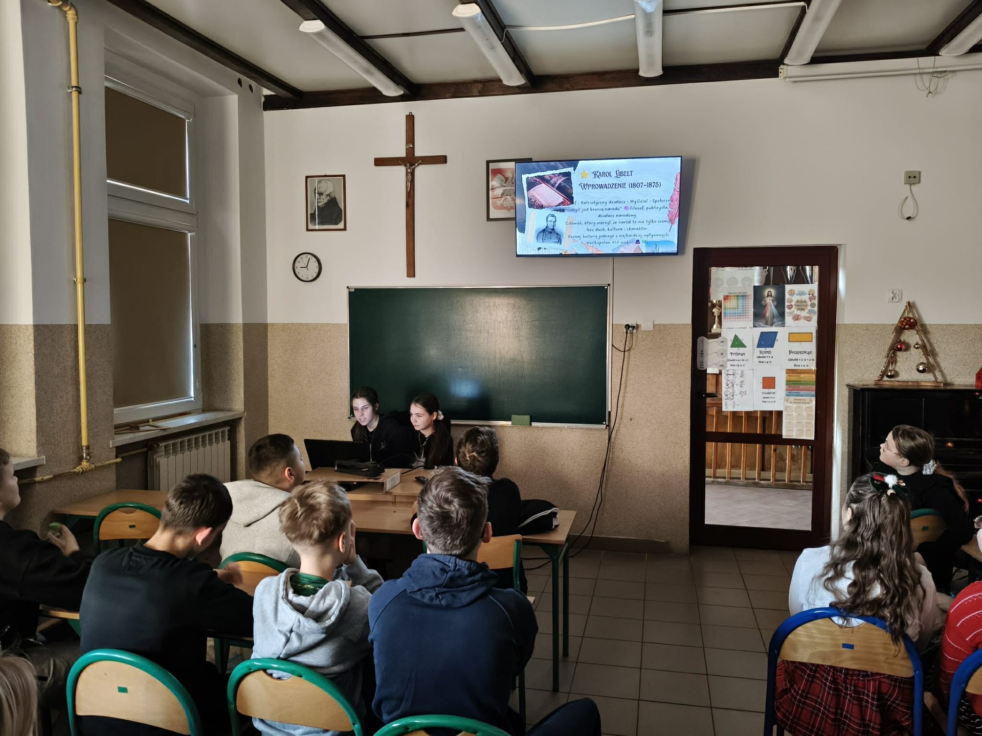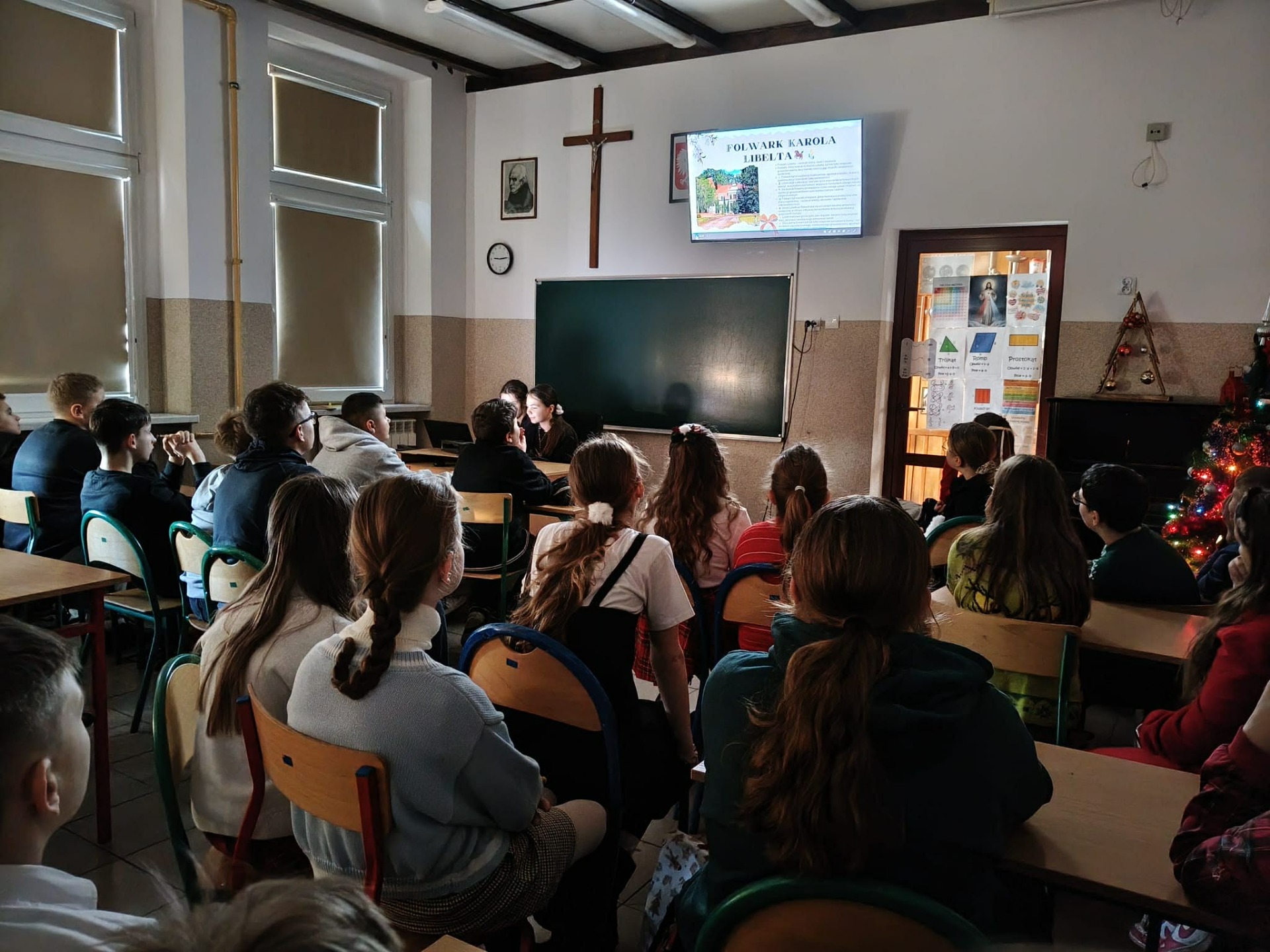 W dniu dzisiejszym w naszej szkole miała miejsce nietypowa lekcja. Z samego rana zebraliśmy się wszyscy, aby w skupieniu wysłuchać informacji o polskim filozofie, działaczu społecznym i politycznym Karolu Libelcie. W tym celu uczennice z SU Sandra Zadroga i Honorata Kitkowska przygotowały prezentację o życiu i działalności tego wybitnego mieszkańca naszego regionu. Na koniec uczniowie sprawdzili swoją wiedzę rozwiązując quiz. W przygotowaniu prezentacji pomocą służyła pani Anna Kuchta.